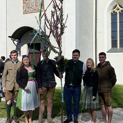 So feierten Groß und Klein mit Vikar Gerhard Hatzmann und Diakon Michi Zepf die heilige Messe zum Palmsonntag in einem schönen Miteinander. Die Kindergartenkinder sowie einige MS-Schülerinnen gestalteten die Feier mit und die MINIS versahen nicht nur ihren Dienst am Altar, sondern trugen auch die „Passion“ vor - in einer einfacheren Fassung, mit passenden Liedstrophen und Symbolen. Auch die Landjugend nahm teil und kam nach guter Tradition mit ihrem großen Palmbuschen.
